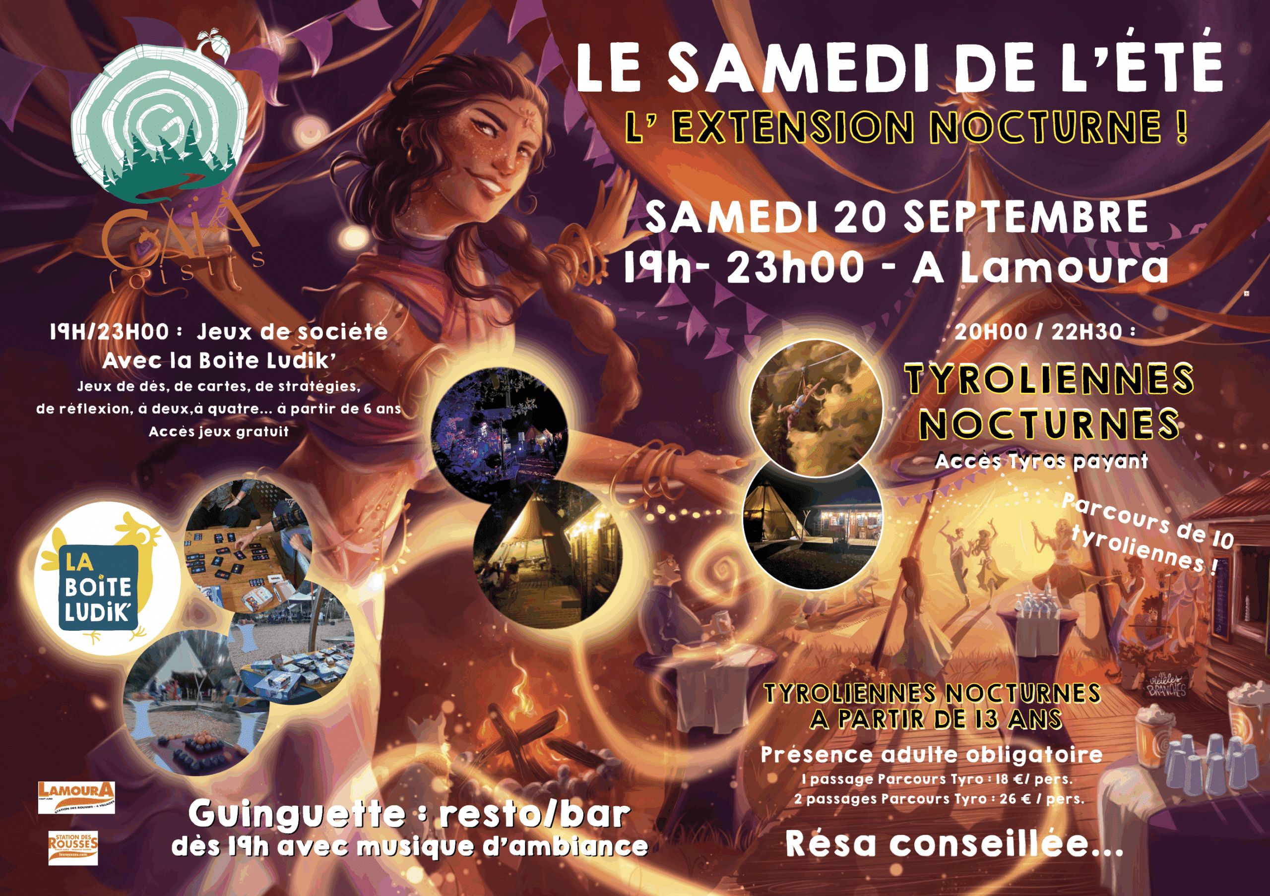 EVENEMENTSProgrammationGAIA Loisirs c’est aussi un lieu culturel vivant et intergénérationnel Inscrivez-vous à la newsletter SAMEDI 20 SEPTEMBRE 2025 19H-23H EXTENSION NOCTURNE ! Soirée jeux de société avec LA BOITE LUDIK - Accès libreTyroliennes de Nuit à partir de 13 ans : 1 passage 18 euros / 2 passage 26 eurosMineurs accompagnés d'un adulte sur les tyroliennes. Merci