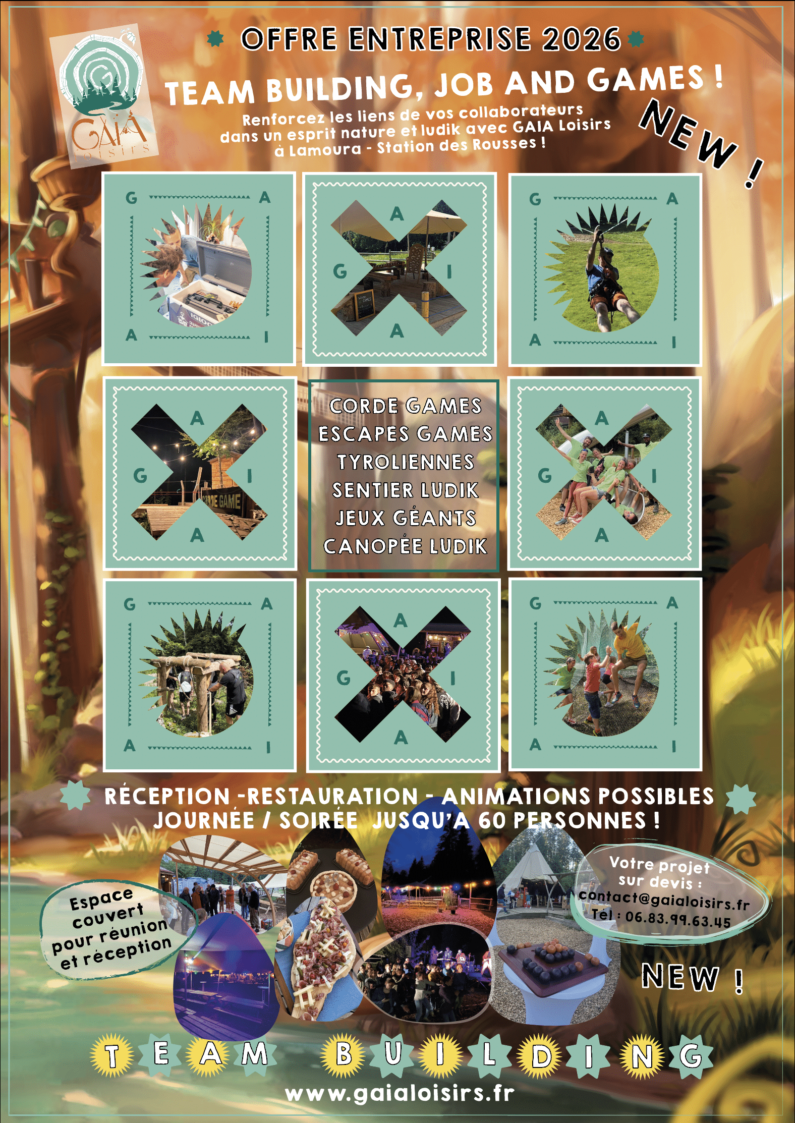 Activités sportives, dynamiques, naturelles ou encore ludiques, il y en a pour tous les goûts chez GAIA Loisirs : Filets suspendus, Sentier LudiK’, EXPLOR’Games, Jeux géants en bois Balades à Cheval… au choix pour des temps conviviaux assurés !